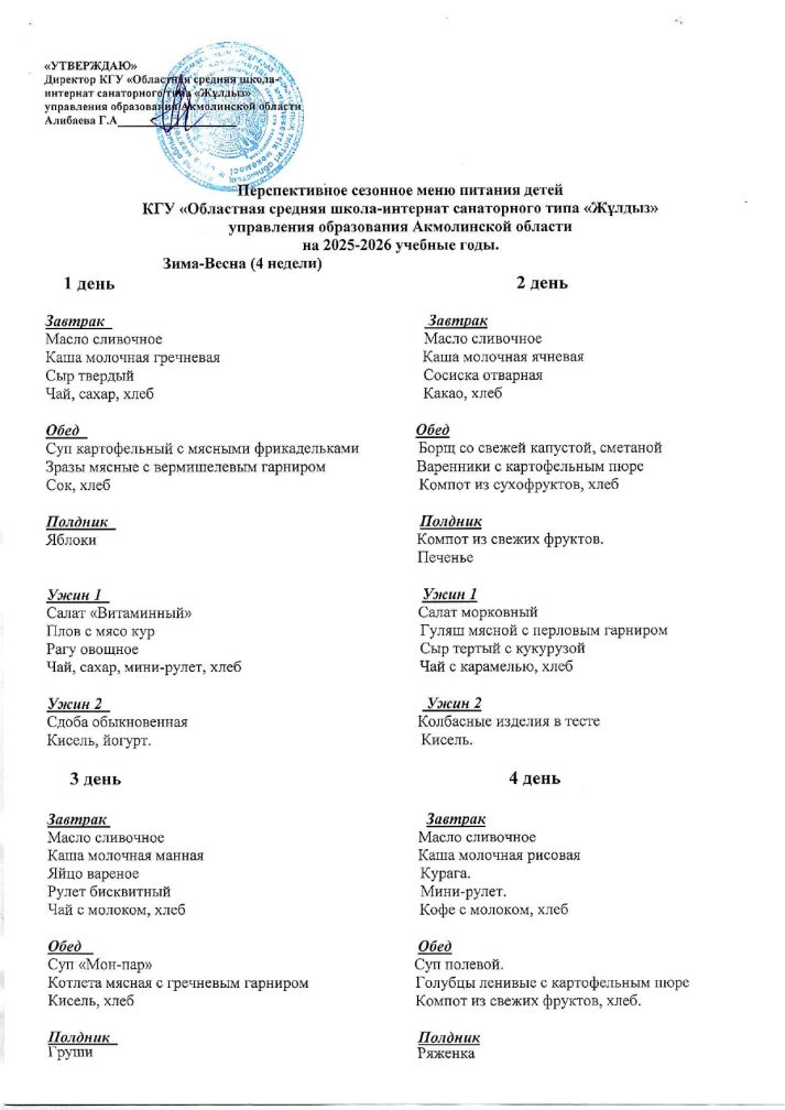2025–2026 оқу жылына арналған балалардың қыс–көктем маусымдық перспективалық тамақтану мәзірі (4 апта)